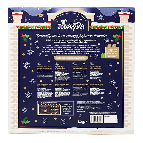Officially approved by the Vegan Society®, our new Vegan Advent Calendar opens up like a giant Christmas storybook and depicts a snowy scene of Joe’s Popcorn Kitchens at Christmastime.