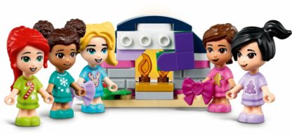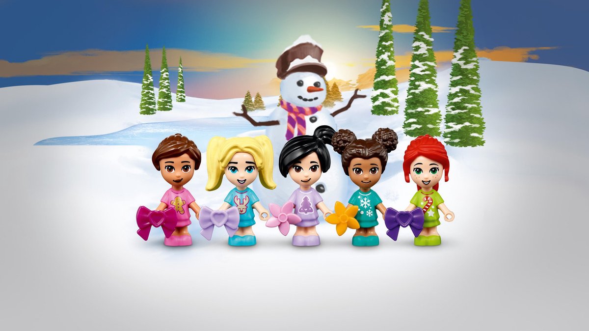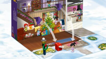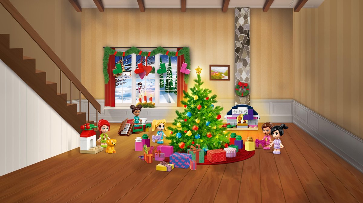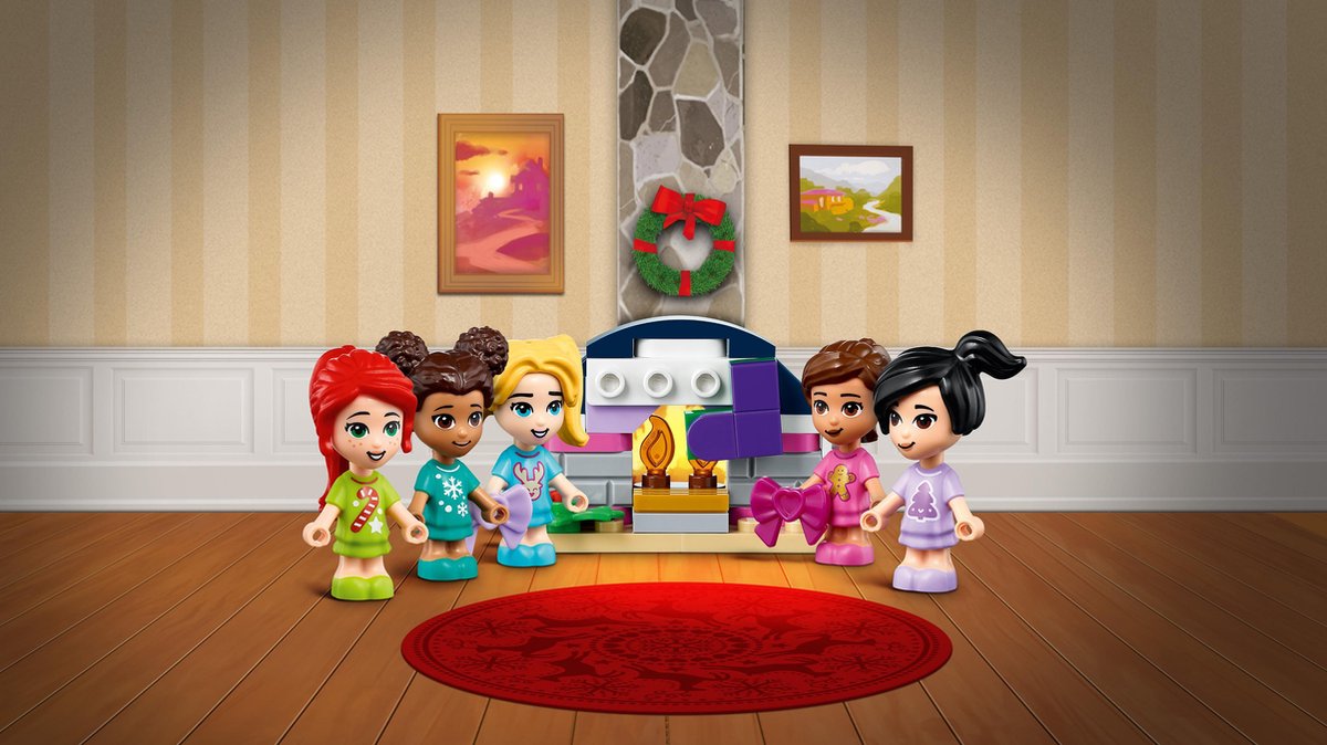 Tussen de 24 cadeautjes vinden kinderen 5 LEGO Friends personages in de vorm van een micropoppetje. Ook is er voor elke vriendin een cadeautje dat bij haar interesses past. Met deze creatieve bouwset kunnen kinderen de gezelligheid van de feestdagen naspelen, zoals een boek lezen in een gemakkelijke stoel bij het haardvuur naast de kerstboom.