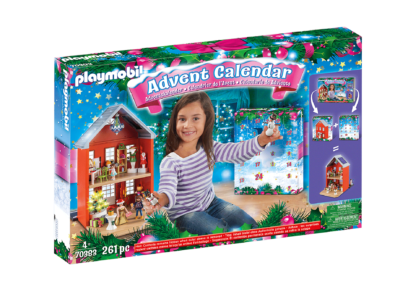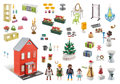 Wachten op Kerstmis wordt een bijzonder genoegen met de nieuwe grote adventskalender “Kerst in het stadhuis” van PLAYMOBIL®. Tot kerstavond wordt er een compleet kersthuis met meubilair gebouwd. Achter de 24 deuren van deze adventskalender zitten tal van accessoires, zoals een kerstboom met decoratie- en lichtmodule, geschenkdozen om te vullen, geschenken, een dressoir en tafels, maar ook taarten, muffins en koekjes voor het kerstfeest. Op de bovenverdieping bevindt zich de kleedkamer, die liefdevol kan worden ingericht met planken, kleedpoppen, jurken, make-uptafel en nog veel meer accessoires. Hier kan de familie zich voor het feest omkleden. De speelset bestaat uit een huis van twee verdiepingen met meubilair, vier PLAYMOBIL®-figuren en stickers voor kerstversiering. Na Kerstmis kunnen de etiketten weer verwijderd worden zodat het huis ook in neutrale vorm het hele jaar door gebruikt kan worden.