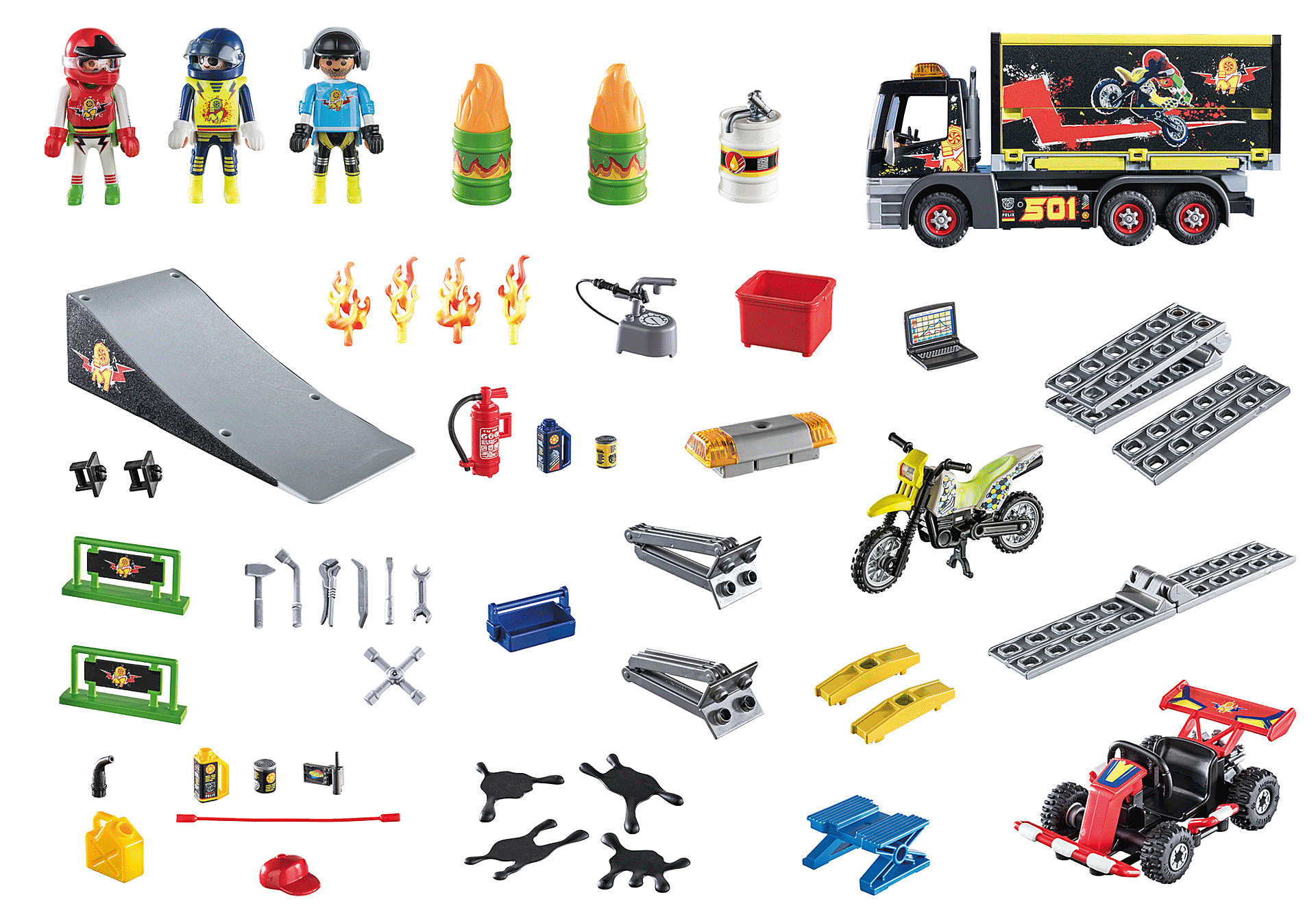 Grenzeloze actie bij de grote stuntshow! De monteurs controleren de voertuigen nog één keer voordat de stoere stuntman met zijn motor van de helling af en door het vuur spingt. Vervolgens pakt de crew alles in en rijdt naar de volgende locatie.