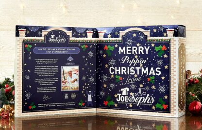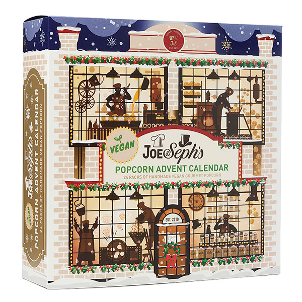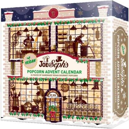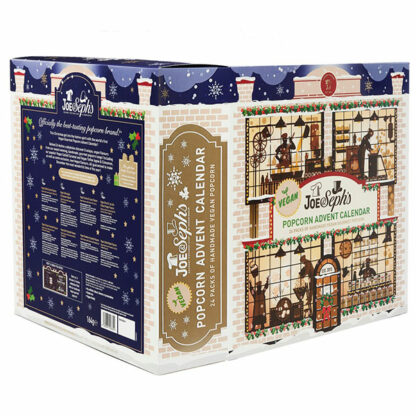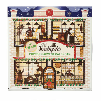 Officially approved by the Vegan Society®, our new Vegan Advent Calendar opens up like a giant Christmas storybook and depicts a snowy scene of Joe’s Popcorn Kitchens at Christmastime.