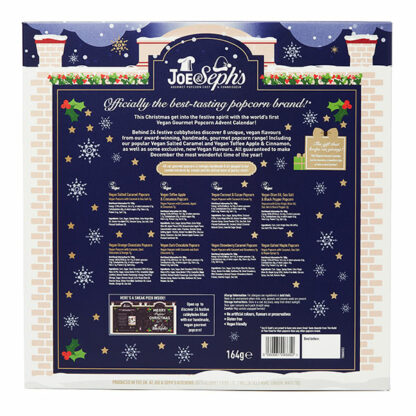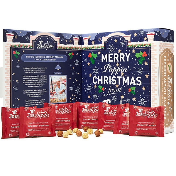 Behind 24 festive cubbyholes discover mini packs of Joe & Seph’s handmade popcorn in 8 unique, vegan flavours! Including Joe & Seph’s popular Vegan Salted Caramel and Vegan Toffee Apple & Cinnamon, as well as several new and exclusive Vegan flavours. All guaranteed to make December the most wonderful time of the year!