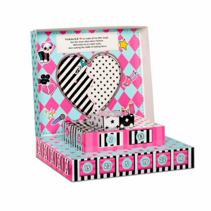 Pull up to pop up the new 3-tier packaging, then follow the numbers to unbox Tricksta B.B., her fashions, her shoes, and her accessories with bold patterns that make her stand out on any runway.