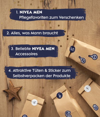 Verzorgende producten – de zorgvuldig geselecteerde verzorgingsproducten in de Nivea Men DIY-kalender overtuigen door hun verzorgende werking en de bewezen Nivea-kwaliteit.