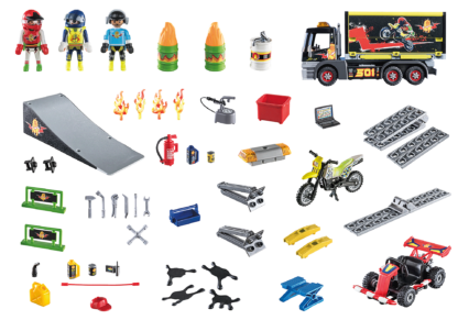 Grenzeloze actie bij de grote stuntshow! De monteurs controleren de voertuigen nog één keer voordat de stoere stuntman met zijn motor van de helling af en door het vuur spingt. Vervolgens pakt de crew alles in en rijdt naar de volgende locatie.