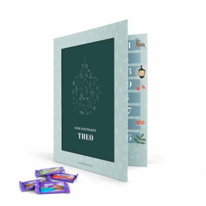 Jouw persoonlijke adventskalender is gevuld met 25 overheerlijke Milka chocolaatjes in verschillende smaken. Vanaf 1 december mag je er hier iedere dag eentje van opsmikkelen. Is het zelf maken van een unieke aftelkalender moeilijk? Nee hoor! Je voegt alleen je mooiste foto en/of naam naar keuze toe aan een van de feestelijke kerstdesigns. Of wees creatief en upload je eigen creatie. Wij drukken jouw ontwerp vervolgens op de adventkalender. HO HO HO, begin snel met personaliseren!